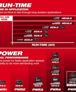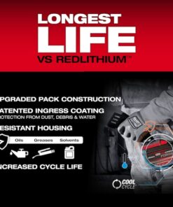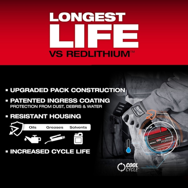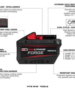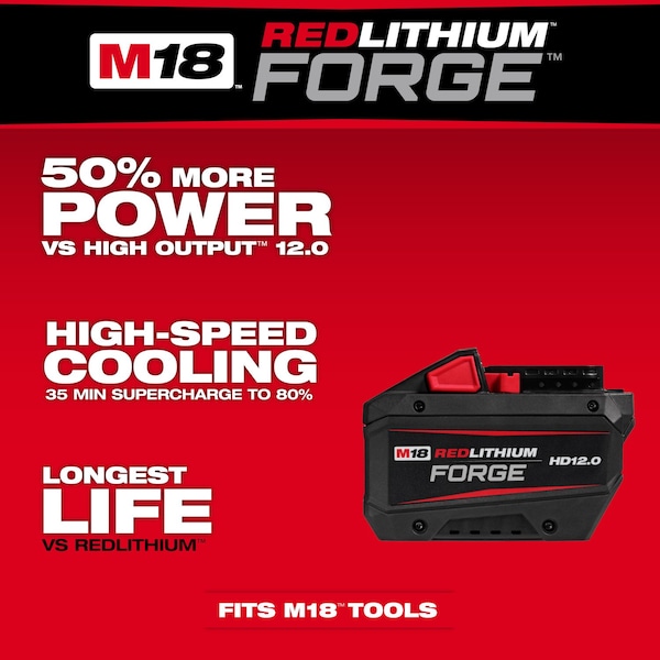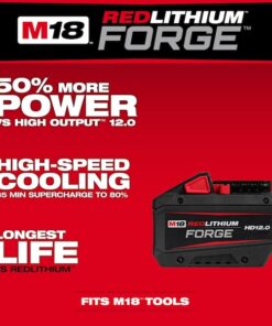 The MILWAUKEE M18 REDLITHIUM FORGE HD12.0 Battery Pack delivers 50% more power than the HIGH OUTPUT 12.0, high-speed cooling for less downtime in high-demand applications, 35-minute supercharge to 80%, and the longest life vs REDLITHIUM batteries. REDLITHIUM FORGE are Milwaukee’s most powerful, fastest charging, and longest-life batteries. The M18 REDLITHIUM FORGE HD12.0 delivers 12 amp hours of runtime with 50% more power than the HIGH OUTPUT 12.0, providing optimal power and runtime for demanding applications. The M18 REDLITHIUM FORGE HD12.0 is COOL-CYCLE capable. COOL-CYCLE Active Cooling System provides high-speed cooling for less downtime. Patented ingress coating provides increased protection to maximize active cooling through an upgraded venting design. The high-speed cooling feature works with M18 chargers that have COOL-CYCLE capability. When paired with the M18 Dual Bay Simultaneous Super Charger, this battery charges in just 35 minutes to 80%, getting you back to work faster than ever before. This lithium-ion battery has the longest life, the most recharges, and the best performance over the life of the battery. It is also designed with resistant housing for increased protection against exposure to common oils, greases, and solvents. Built-in REDLINK Intelligence protects the battery from overloads, preventing you from damaging your cordless power tools in heavy-duty situations. Fully compatible with 250+ M18 solutions.