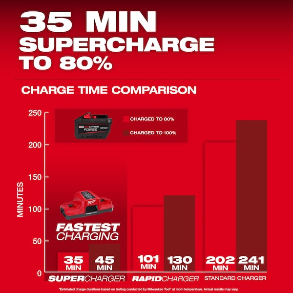 - 35min Supercharge to 80% with the M18TM Dual Bay Simultaneous Super Charger