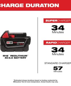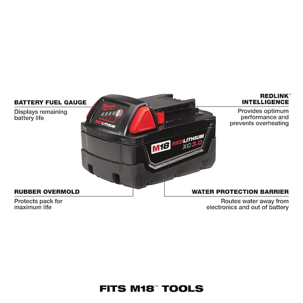 Delivers more runtime, power and speed than standard lithium-ion batteries. The M18 REDLITHIUM XC Extended Capacity Battery is designed with superior pack construction, electronics, and performance to optimize work per charge and work over pack life. It offers 3.0 amp-hours of runtime. With built-in Milwaukee durability, this battery runs cooler and performs in climates below 0??F/-18??C.Managed by Milwaukee??s exclusive REDLINK Intelligence, the battery features overload protection to prevent you from damaging your cordless power tools in heavy-duty situations, while the discharge protection prevents cell damage. The temperature management system and individual cell monitoring help maximize battery life. Use this extended-capacity battery to power your Milwaukee M18 cordless power tools.