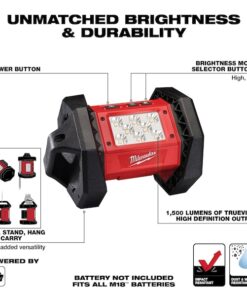 M18 ROVER Flood Light delivers up to 30% brighter light output than 250-watt halogen floodlights. The LED floodlight illuminates large workspaces with 8 high-quality LEDs that provide 1,500 lumens of TRUEVIEW High Definition Output. This floodlight delivers up to 10 hours of run-time on a single charge using an M18 REDLITHIUM XC5.0 battery. The cordless floodlight has an innovative roll cage design and a replaceable impact-resistant lens, that stands up to the toughest working conditions. This compact floodlight features an octagonal shape so it can be positioned and used at multiple angles, and the versatile design delivers hands-free options for a variety of applications. This floodlight has a limited lifetime LED warranty, LEDs never need to be replaced. MILWAUKEE ROVER Flood Lights are built to go anywhere and withstand anything.