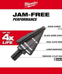 Step Drill Bit, High Speed Steel, Black Oxide, 7/8 in to 1 7/32 in Size Range, Straight with Three Flats, 3/8 in Shank Diameter, 3 in Overall Length