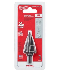 Step Drill Bits with JAM-FREE Performance feature a dual-flute design delivering up to 2X faster hole times, up to 4X longer life and up to 50% more holes per battery charge than competitors. Ideal for drilling small and large-diameter holes in steel and plastic, these bits are Optimized for Cordless Drills in High Speed. The Rapid Strike tip allows for a fast and accurate start that generates less heat, resulting in longerbit tip life. Black oxide coating also enhances durability, hole quality and bit life. For user convenience and accuracy, each bit has laser-engraved reference marks you can see while drilling. The 3-flat Secure-Grip shank ensures a solid connection with the drill chuck. The #9 Step Drill Bit has 2 hole sizes: 7/8″ and 1-1/8″. Jam-Free Performance in high speed with most professional 18 volt cordless drills with lithium-ion battery technology.