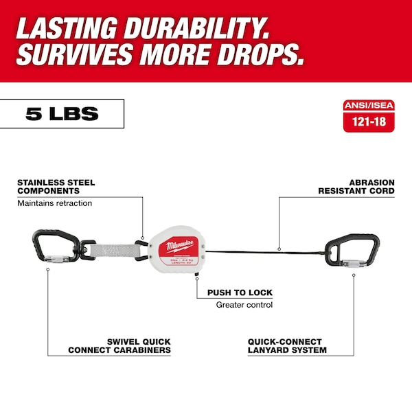 Tool Lanyard, Color Black, White, Anchorage End Connection Carabiner, Anchorage End Material Stainless Steel, For Tool Type Hand Tools, Maximum Working Length 50 in, Tool End Connection Carabiner, Hardware Material Stainless Steel, Includes (1) 5lb Retractable Lanyard, Series Nylon; Stainless Steel, Tether Style Retractable, Tethering Component Retractable, Weight Capacity 5 lb