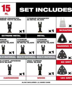 Oscillating Tool Blade Set, Blade Type Scraping, Connection Style Universal Open-Back, Blade Shape Straight, Blade Material Bi-Metal, Metal, Stainless Steel, Blade Diameter Not Applicable, Blade Width 3/8 in, 1 3/8 in, 1 3/4 in, 2 1/2 in, Overall Length 2 5/8 in, 3 9/16 in, 3 11/16 in, 4 1/16 in, Primary Material Application Cement Board, Drywall, Fiber Cement, Metal and Wood, Nail Embedded Wood, Non Ferrous Metal, Plaster, Plastic, Plywood, PVC, Materials Cut Wood, Cut Style Flush Cut