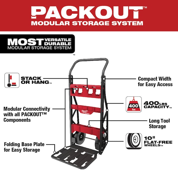 PACKOUT Modular Storage System is the industry’s most versatile and durable storage system. The PACKOUT 2-Wheel Cart has integrated PACKOUT mounting on the base and frame to allow users to securely stack or hang PACKOUT products. With a 400lb weight capacity and 10?? industrial wheels, this cart easily transfers on and off the jobsite. The PACKOUT Modular Storage System allows you to customize your storage system for easy transportation and organization of tools and accessories.
