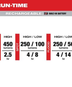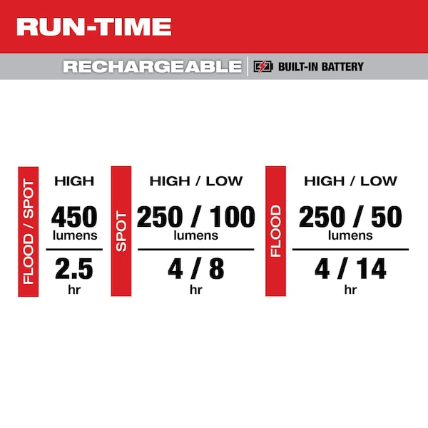 - 5 Light Output Modes: Hybrid Spot/Flood mode: 450-Lumens- 2.5 hours; Spot High: 250-Lumens- 4 hours; Low: 100-Lumens- 8 hours; Flood High mode: 250-Lumens- 4 hours; Low: 100-Lumens- 14-hours;