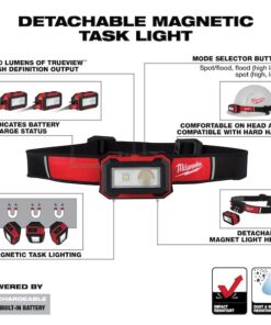 The MILWAUKEE Rechargeable Magnetic Headlamp and Task Light offers a detachable, magnetic task light that delivers 450 Lumens of TRUEVIEW High Definition Output with spot and flood beam options. Its magnetic light head provides fast and easy detachment from the strap holster while also providing the ability to magnet mount the light for hands-free task lighting. Multiple output levels and three separate magnet surfaces on the light head allow for optimization of output and direction of light in extremely tight spaces. Designed to withstand harsh jobsite conditions, this rechargeable headlamp is IP54 rated as weather and dust resistant and survives impacts from up to 2 meters. The Milwaukee Rechargeable Magnetic Headlamp and Task Light built-in battery offer high performance and rechargeable capabilities where compact size is critical. The Milwaukee Rechargeable Magnetic Headlamp and Task Light is covered by a 2-year warranty.