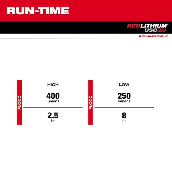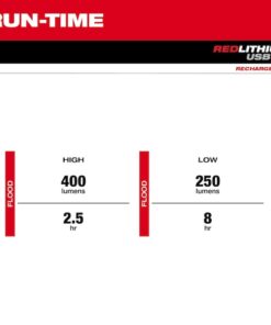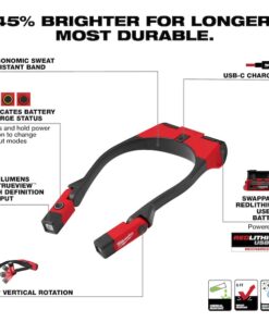 REDLITHIUM USB 400L Neck Light is 45% BRIGHTER FOR LONGER and the MOST DURABLE. This rechargeable neck light provides 400 lumens of TRUEVIEW High-Definition Output and over 8 hours of run-time to keep you working all day. 2 mode options allow you to manage output and run-time, plus a battery gauge in the power button will always inform you how much power you have left before a recharge is needed. The REDLITHIUM USB 400L Neck Light has 130?? of vertical light head rotation for easy positioning and an ergonomic, sweat-resistant band for your comfort. Powered by REDLITHIUM USB this light provides HIGH OUTPUT lighting that stays brighter for longer. The MILWAUKEE REDLITHIUM USB Battery can be recharged in the headlamp via USB-C or swapped out with additional REDLITHIUM USB Batteries for virtually no downtime.The neck light has IP54 ingress protection against dust and water, chemical resistance to harsh chemicals found on site or in the shop, and a drop rating of 6ft, backed by Limited Lifetime Warranty.