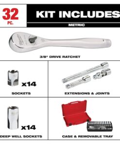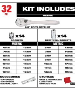 Socket Wrench Set, Standard Socket Count/Style (14) 6-Point, Standard Socket Style/Size Standard 6-Point: 6 mm, 7 mm, 8 mm, 9 mm, 10 mm, 11 mm, 12 mm, 13 mm, 14 mm, 15 mm, 16 mm, 17 mm, 18 mm, 19 mm, Deep Socket Count/Style (14) 6-Point, Deep Socket Style/Size Deep 6-Point: 6 mm, 7 mm, 8 mm, 9 mm, 10 mm, 11 mm, 12 mm, 13 mm, 14 mm, 15 mm, 16 mm, 17 mm, 18 mm, 19 mm, Flex Socket Count/Style None, Drive Size 3/8 in, Drive Type Hand, Alloy Steel, Chrome, Impact Rated Not Impact Rated