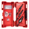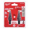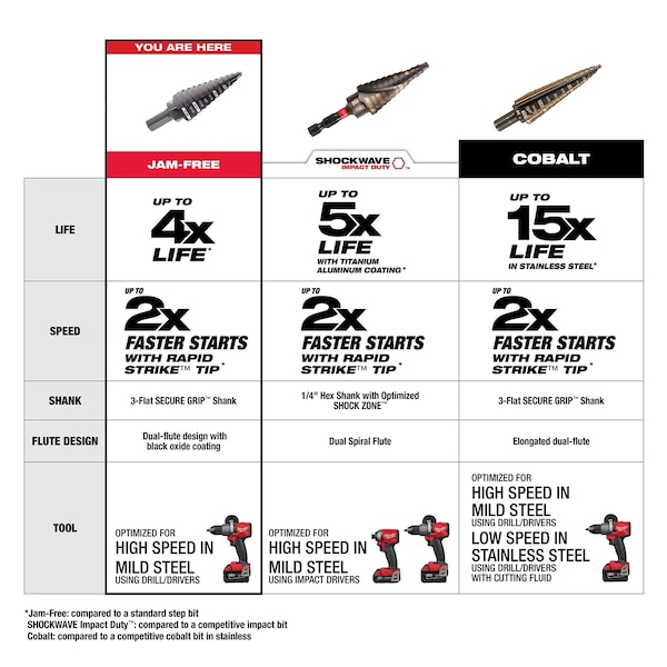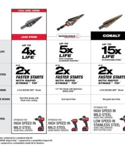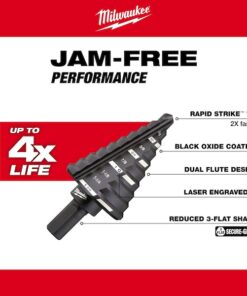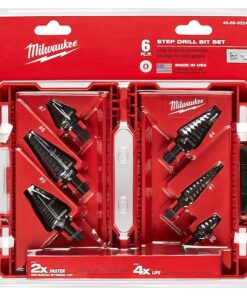 Milwaukee Step Drill Bits with JAM-FREE Performance feature a dual-flute design delivering up to 2X faster hole times, up to 4X longer life and up to 50% more holes per battery charge than competitors. Ideal for drilling small and large-diameter holes in steel and plastic, these bits are Optimized for Cordless Drills in High Speed. The Rapid Strike tip allows for a fast and accurate start that generates less heat, resulting in longer bit tip life. Black oxide coating alsoenhances durability, hole quality and bit life. For user convenience and accuracy, each bit has laser-engraved reference marks you can see while drilling. The 3-flat Secure-Grip shank ensures a solid connection with the drill chuck. The Step Drill Bit 6-Piece Set includes bits #1 (48-89-9201), #4 (48-89-9204), #6 (48-89-9206), #7 (48-89-9207), #8 (48-89-9208) and #9 (48-89-9209). Jam-Free Performance in high speed with most professional 18 volt cordless drills with lithium-ion battery technology.